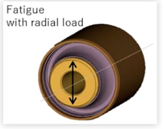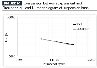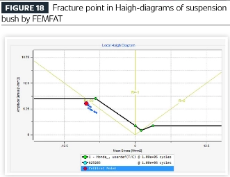 يكشف مخطط هاي لنتائج محاكاة الكلال لجلبة التعليق عن حدوث كسر تحت نسب إجهاد الانضغاط. على الرغم من أن أحمال الشد والضغط يتم تطبيقها بالتساوي على المادة المطاطية، إلا أن التحليل يشير إلى أن الفشل يبدأ في النهاية تحت الضغط.