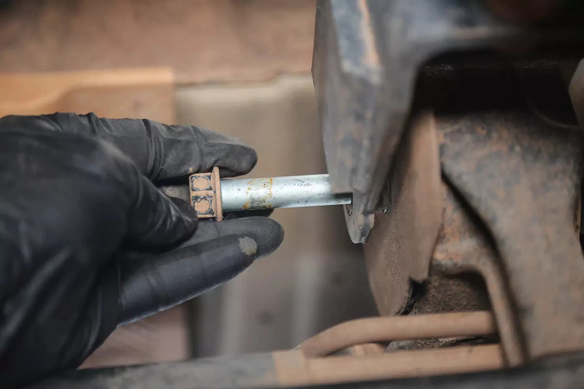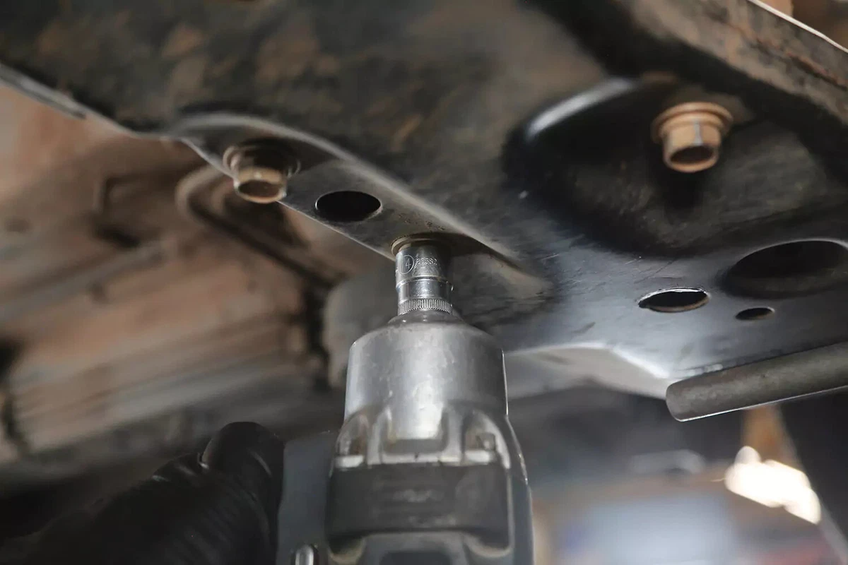 بالنسبة لسيارتنا التجريبية، يحتوي الحامل على ثلاثة مسامير على الإطار الفرعي ومسمار واحد على ناقل الحركة. تقوم أربعة مسامير أخرى بتوصيل دعامة تثبيت ناقل الحركة بناقل الحركة. في معظم المركبات، لا يلزم إزالتها.